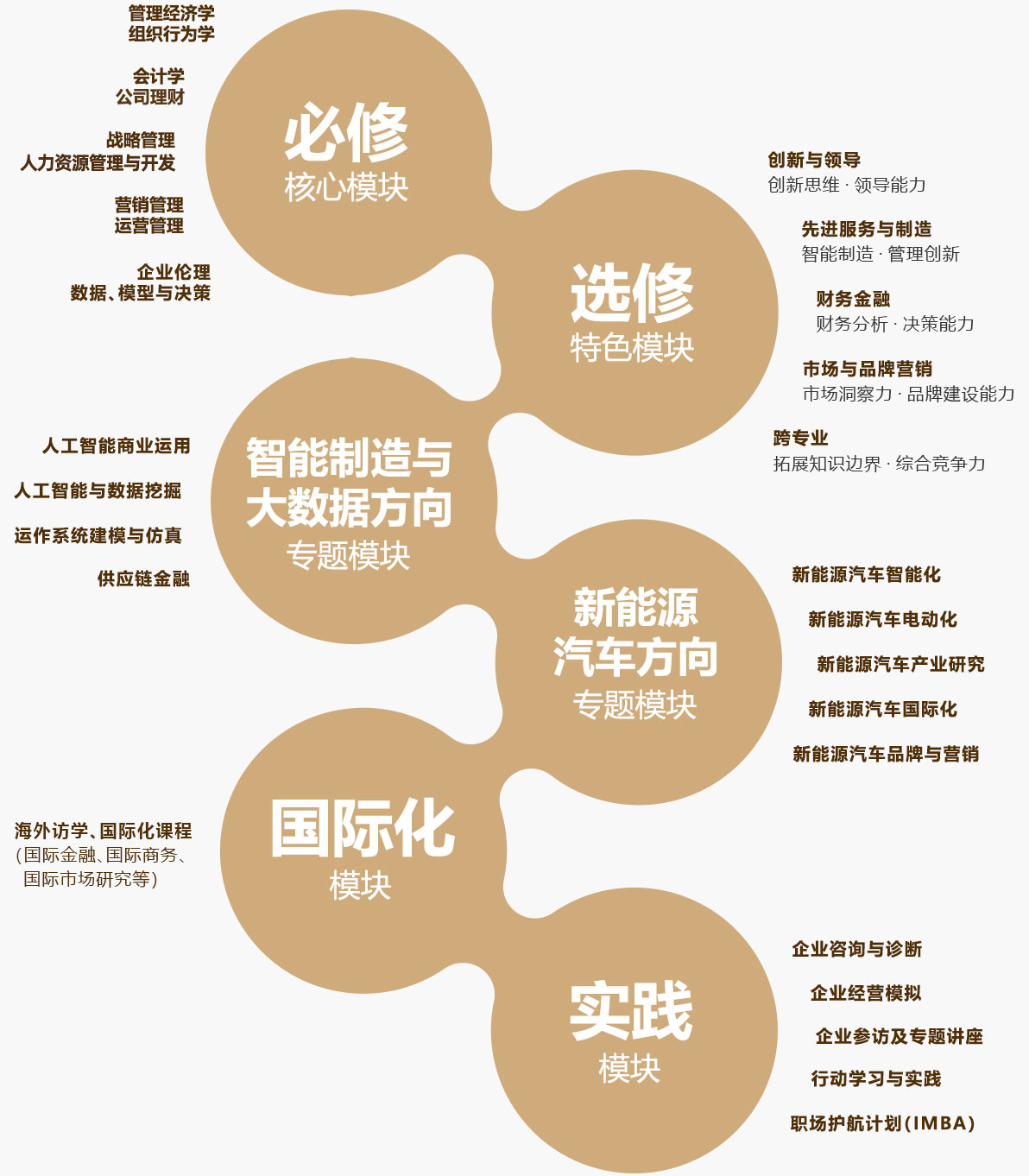 综合模块:行动学习与实践;企业咨询与诊断;企业经营模拟;论文写作与学术规范;企业参访及专题讲座。